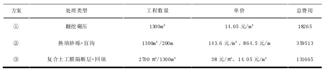 现有低填浅挖路基处理方案有:翻挖碾压、换填及设置盲沟等方案,现将方案对比,以100m长低填浅挖段为例,路基宽度26m,处理厚度50cm,复合土工膜隔断层与传统低填浅挖路基处理方案经济分析对比情况见表1。